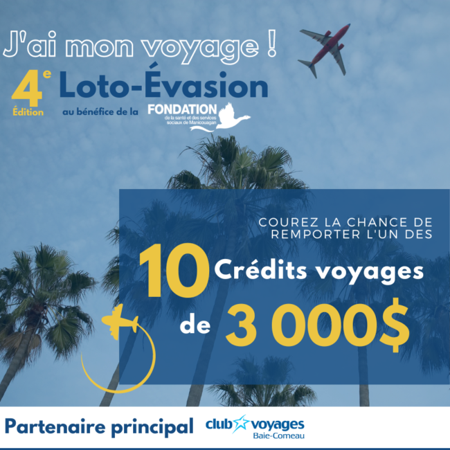 La Fondation SSSM est heureuse d’annoncer le grand retour de la Loto-Évasion, J’ai mon voyage ! En collaboration avec le Club Voyages Baie-Comeau, vous êtes invité à vous procurer l’un des 500 billets de la Loterie. Vous courez la chance de gagner l’un des 10 crédits voyages de 3 000 $. Les employés, médecins, retraités et…